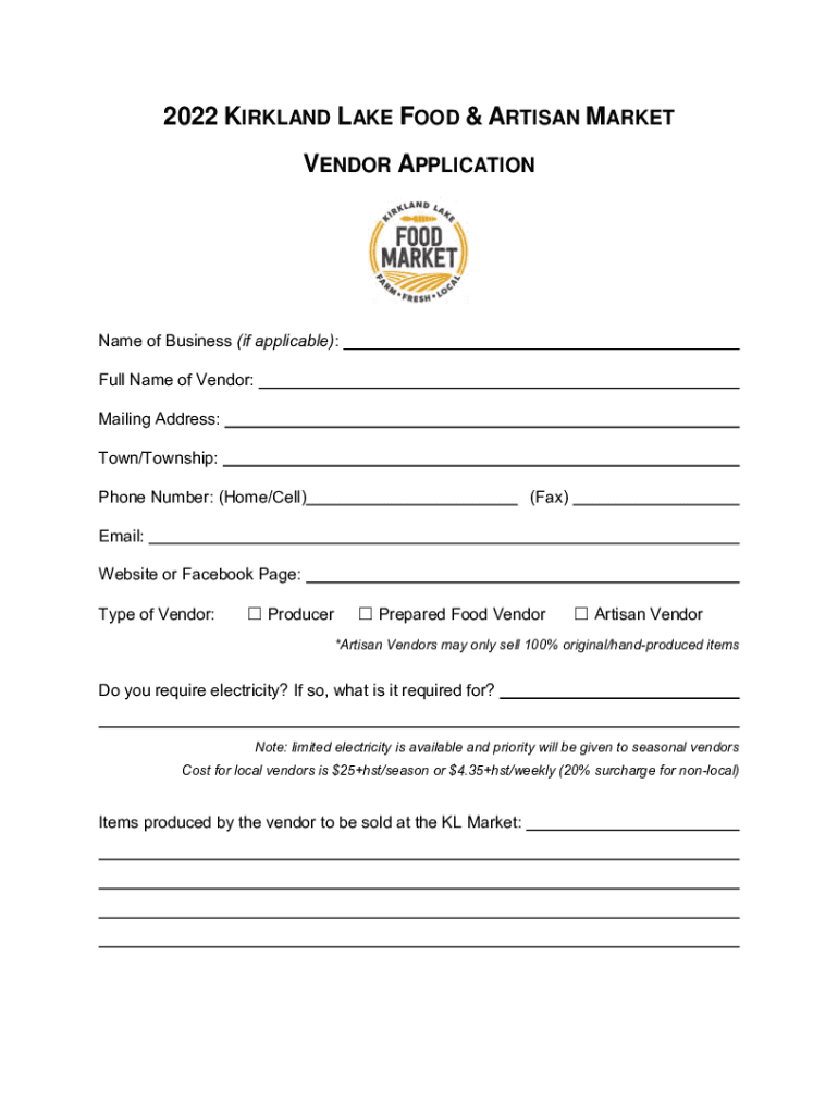 2022 KIRKLAND LAKE FOOD & ARTISAN MARKET VENDOR APPLICATIONName of Business (if applicable): Full Name of Vendor: Mailing Address: Town/Township: Phone Number: (Home/Cell)(Fax)Email: Website or Facebook
