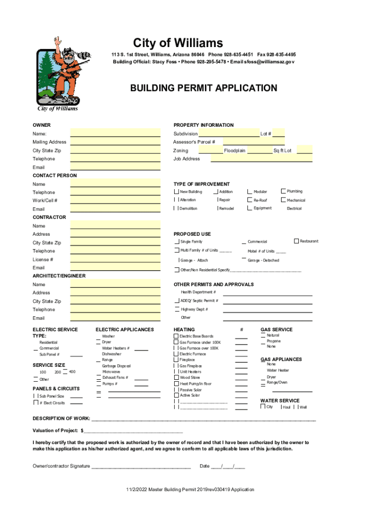 Building Official: Stacy FOSS Phone 9282955478 Email sfoss@williamsaz.govBUILDING PERMIT APPLICATIONOWNERPROPERTY