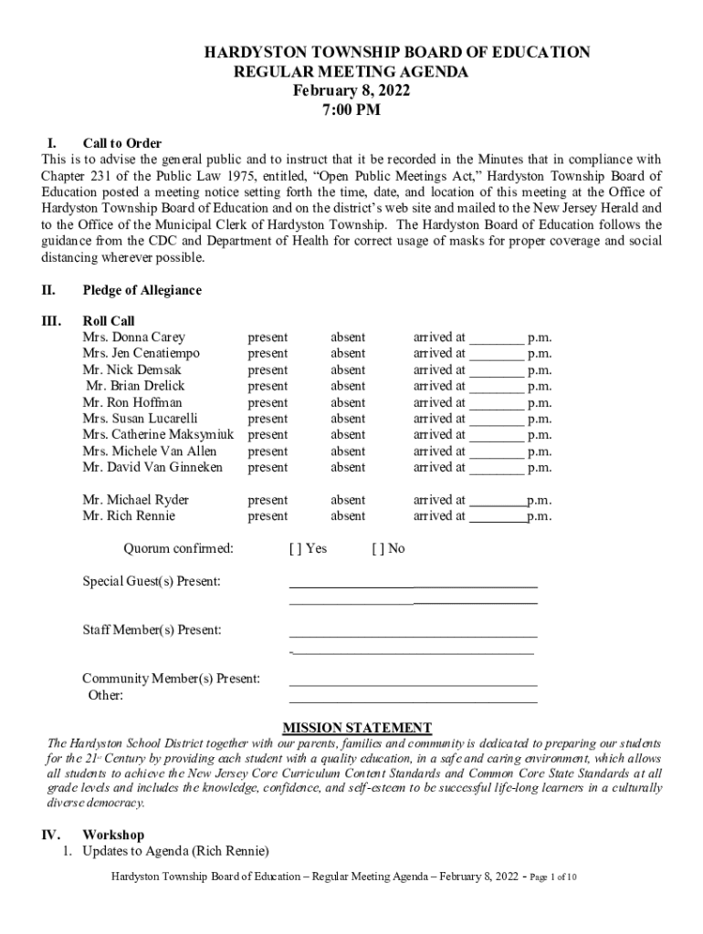 HARRISON TOWNSHIP BOARD OF EDUCATION REGULAR MEETING AGENDA February 8, 2022 7:00 PM I. Call to Order This is to advise the public and to instruct that it be recorded in the Minutes that in compliance