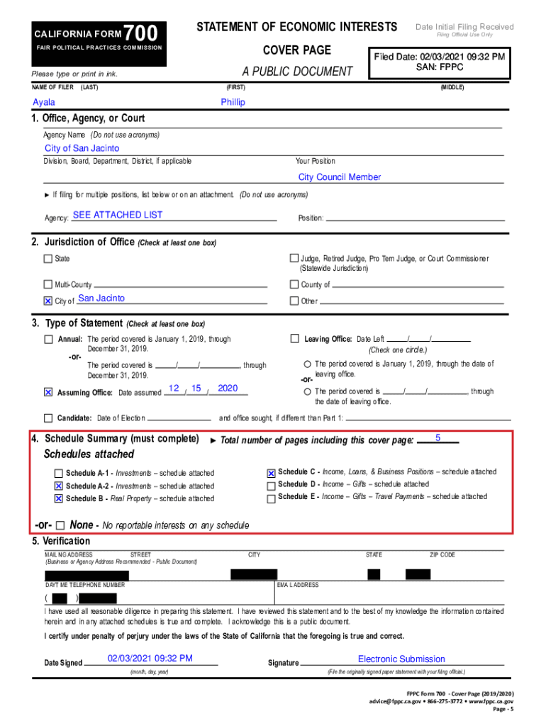 Public officials filing the economic interests form 700 must report financial interests, investments, business positions, income sources, and gifts received.
