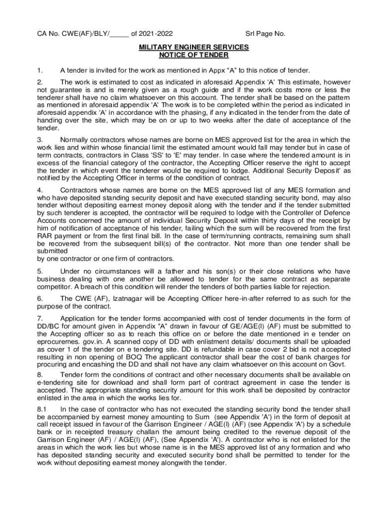 CA No. CWE(AF)/BLY/___ of 20212022Srl Page No. MILITARY ENGINEER SERVICES NOTICE OF TENDER 1. A tender is invited for the work as mentioned in Apex A to this notice of tender.2. The work is estimated