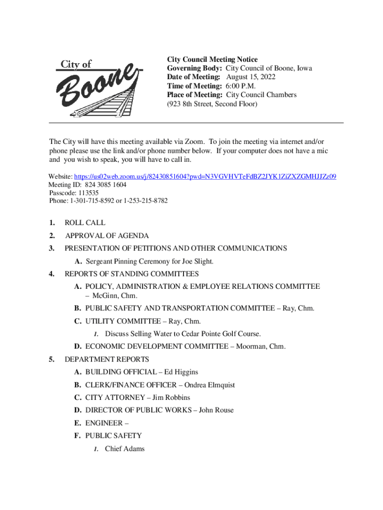 City Council Meeting Notice Governing Body: City Council of Boone, Iowa Date of Meeting: August 15, 2022, Time of Meeting: 6:00 P.M. Place of Meeting: City Council Chambers (923 8th Street, Second