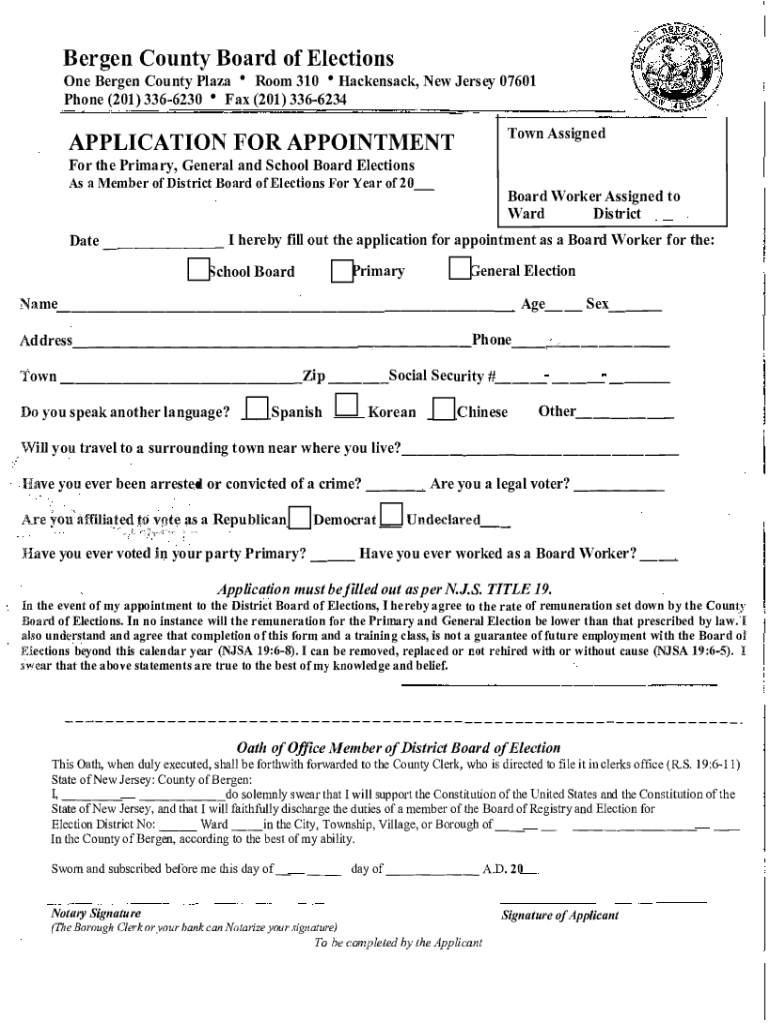 Bergen County Board of Elections Bergen County Plaza Room 310 Hackensack, New Jersey 07601 Phone (201) 3366230 Fax (201) 3366234APPLICATION FOR Appointment the Primary, General and School Board Elections