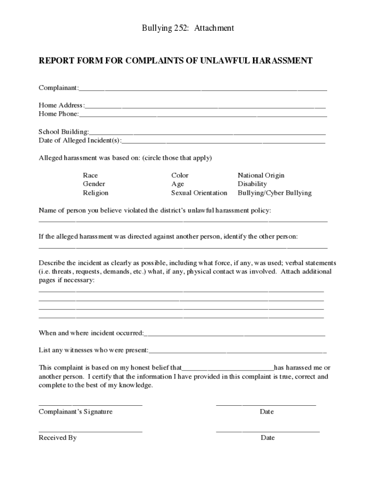 Bullying 252: AttachmentREPORT FORM FOR COMPLAINTS OF UNLAWFUL HARASSMENT Complainant:___ Home Address:___ Home Phone:___ School Building:___ Date of Alleged Incident(s):___ Alleged harassment was