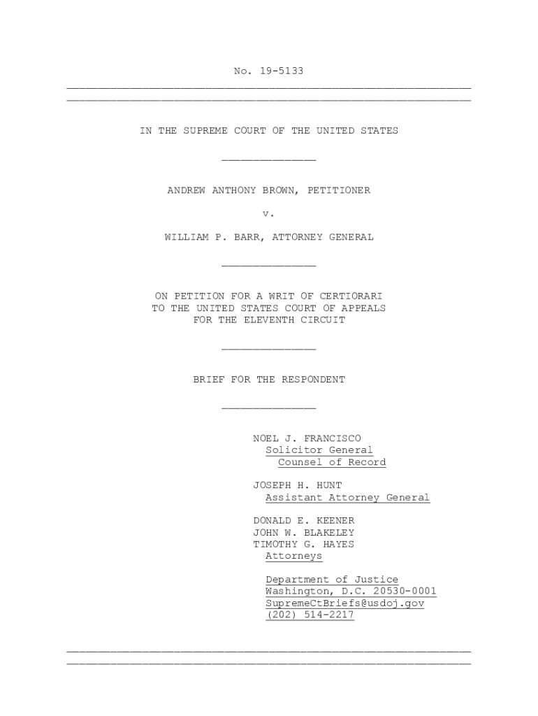 No.195133 ___ ___ INTHESUPREMECOURTOFTHEUNITEDSTATES ___ ANDREWANTHONYBROWN, PETITIONER v. WILLIAM.BARR, ATTORNEYGENERAL ___ ONPETITIONFORAWRITOFCERTIORARI TOTHEUNITEDSTATESCOURTOFAPPEALS FORTHEELEVENTHCIRCUIT
