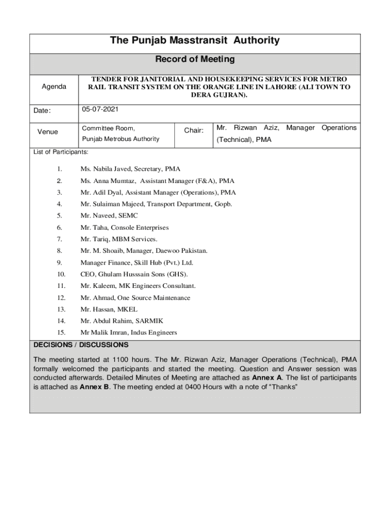 The Punjab Mass transit Authority Record of Meeting AgendaTENDER FOR JANITORIAL AND HOUSEKEEPING SERVICES FOR METRO RAIL TRANSIT SYSTEM ON THE ORANGE LINE IN LAHORE (ALI TOWN TO ERA GUJRAT). 05072021Date: