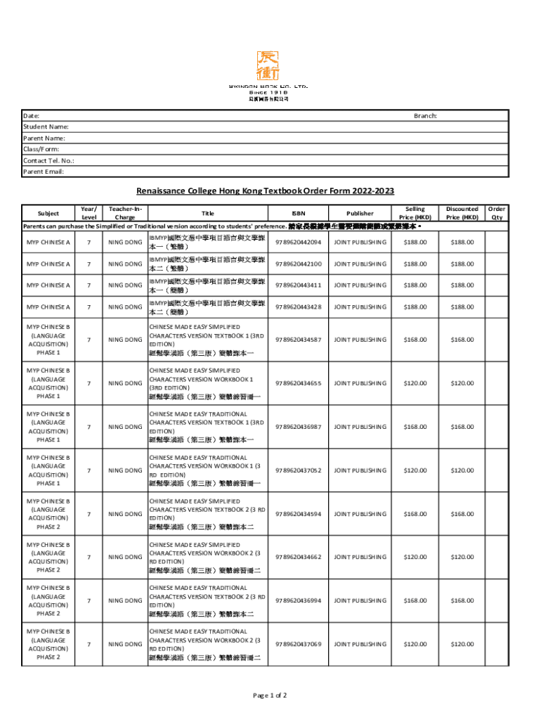Date:Branch:Student Name: Parent Name: Class/Form: Contact Tel. No.: Parent Email:Renaissance College Hong Kong Textbook Order Form 20222023 Year/ TeacherInTitle ISBN Level Charge Parents can purchase