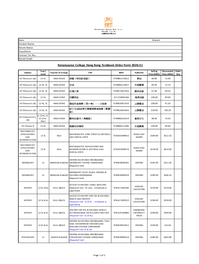 Parent Email:Renaissance College Hong Kong Textbook Order Form 202021
