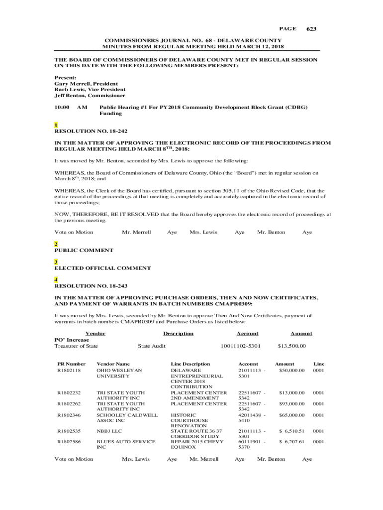 PAGE623COMMISSIONERS JOURNAL NO. 68 DELAWARE COUNTY MINUTES FROM REGULAR MEETING HELD MARCH 12, 2018, THE BOARD OF COMMISSIONERS OF DELAWARE COUNTY MET IN REGULAR SESSION ON THIS DATE WITH THE FOLLOWING