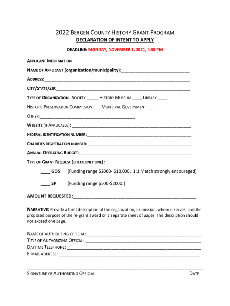 2022 BERGEN COUNTY HISTORY GRANT PROGRAM DECLARATION OF INTENT TO APPLY DEADLINE: MONDAY, NOVEMBER 1, 2021, 4:30 APPLICANT INFORMATION NAME OF APPLICANT (organization/municipality):___ ADDRESS:___