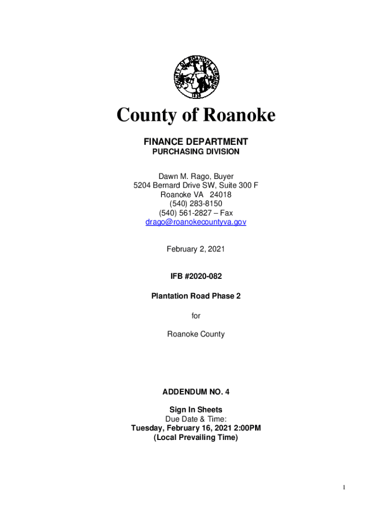 County of Roanoke FINANCE DEPARTMENT PURCHASING DIVISION Dawn M. Ago, Buyer 5204 Bernard Drive SW, Suite 300 F Roanoke VA 24018 (540) 2838150 (540) 5612827 Fax drago@roanokecountyva.govFebruary 2,