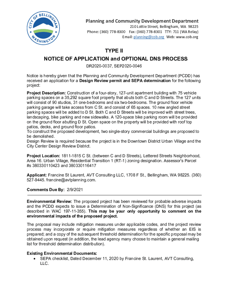 Planning and Community Development Department 210 Lottie Street, Bellingham, WA 98225 Phone: (360) 7788300 Fax: (360) 7788301 TTY: 711 (WA Relay) Email: planning@cob.org Web: www.cob.orgTYPE II NOTICE