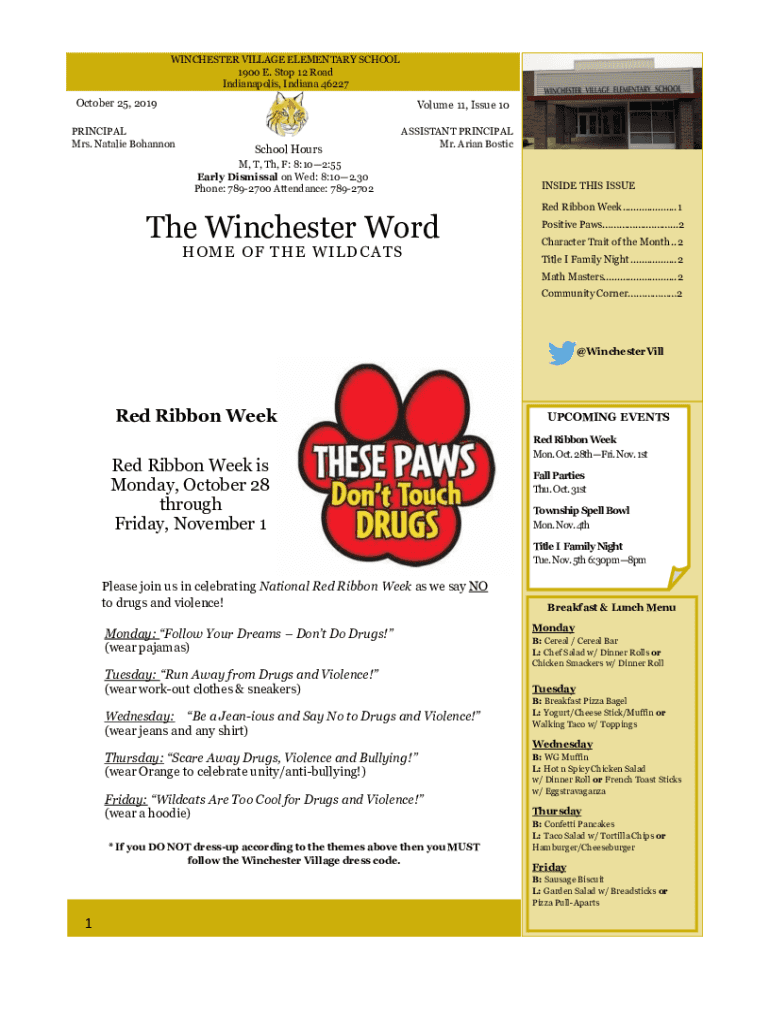 WINCHESTER VILLAGE ELEMENTARY SCHOOL 1900 E. Stop 12 Road Indianapolis, Indiana 46227October 25, 2019 PRINCIPAL Mrs. Natalie BohannonVolume 11, Issue 10School HoursASSISTANT PRINCIPAL Mr. Arian Bossism,