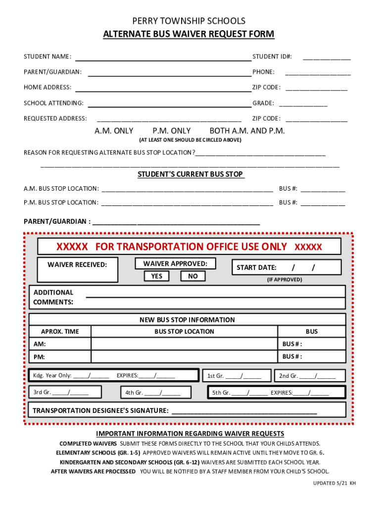 PERRY TOWNSHIP SCHOOLS ALTERNATE BUS WAIVER REQUEST FORM STUDENT NAME:STUDENT ID#:PARENT/GUARDIAN:PHONE:HOME ADDRESS:ZIP CODE: ___SCHOOL ATTENDING:GRADE: ___REQUESTED ADDRESS:___A. M. ONLY. M. ONLY______ZIP