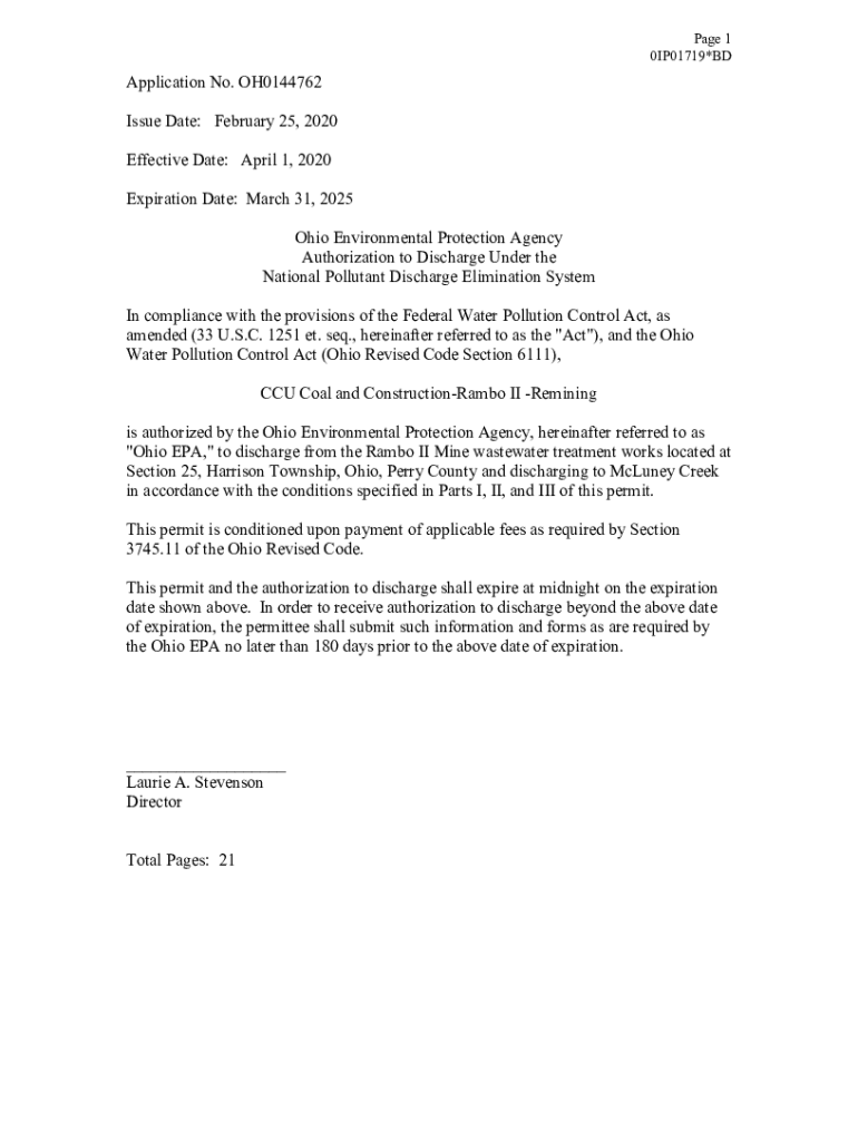 Page 1 0IP01719×Application No. OH0144762 Issue Date: February 25, 2020, Effective Date: April 1, 2020, Expiration Date: March 31, 2025 Ohio Environmental Protection Agency Authorization to Discharge