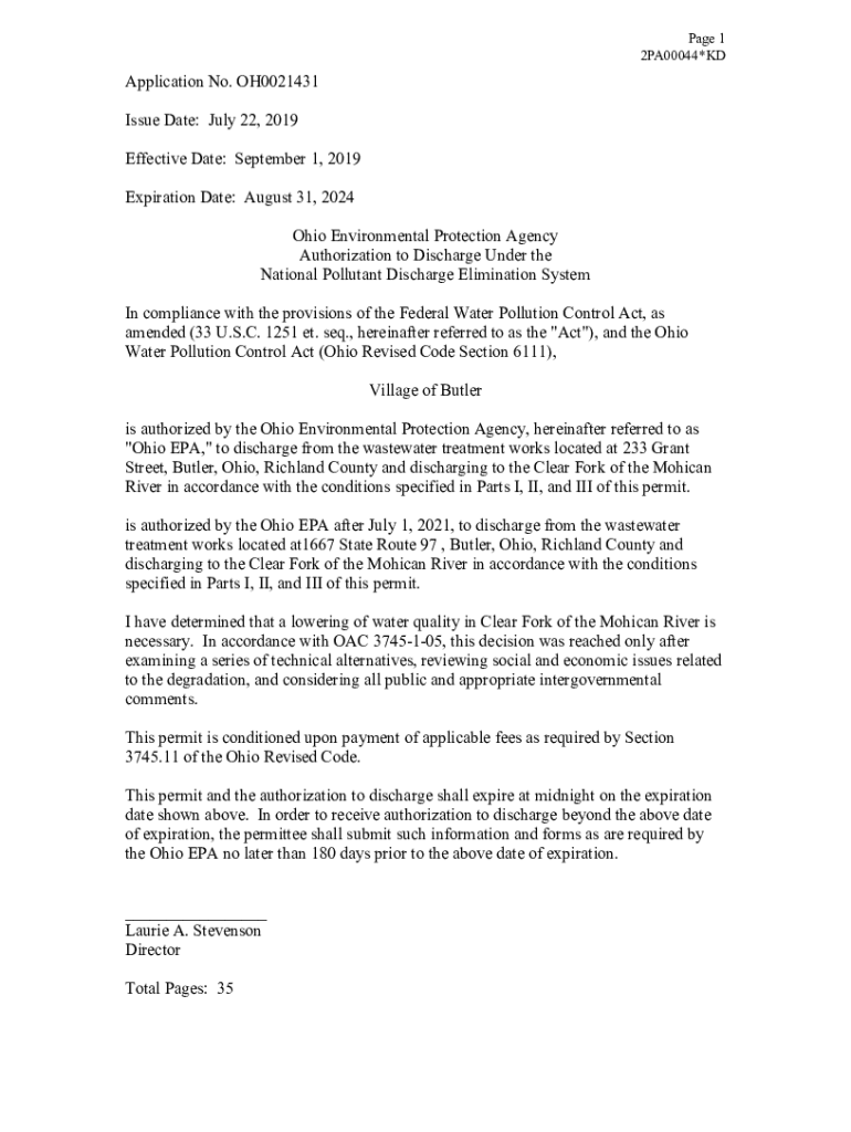 Page 1 2PA00044×Application No. OH0021431 Issue Date: July 22, 2019, Effective Date: September 1, 2019, Expiration Date: August 31, 2024 Ohio Environmental Protection Agency Authorization to Discharge