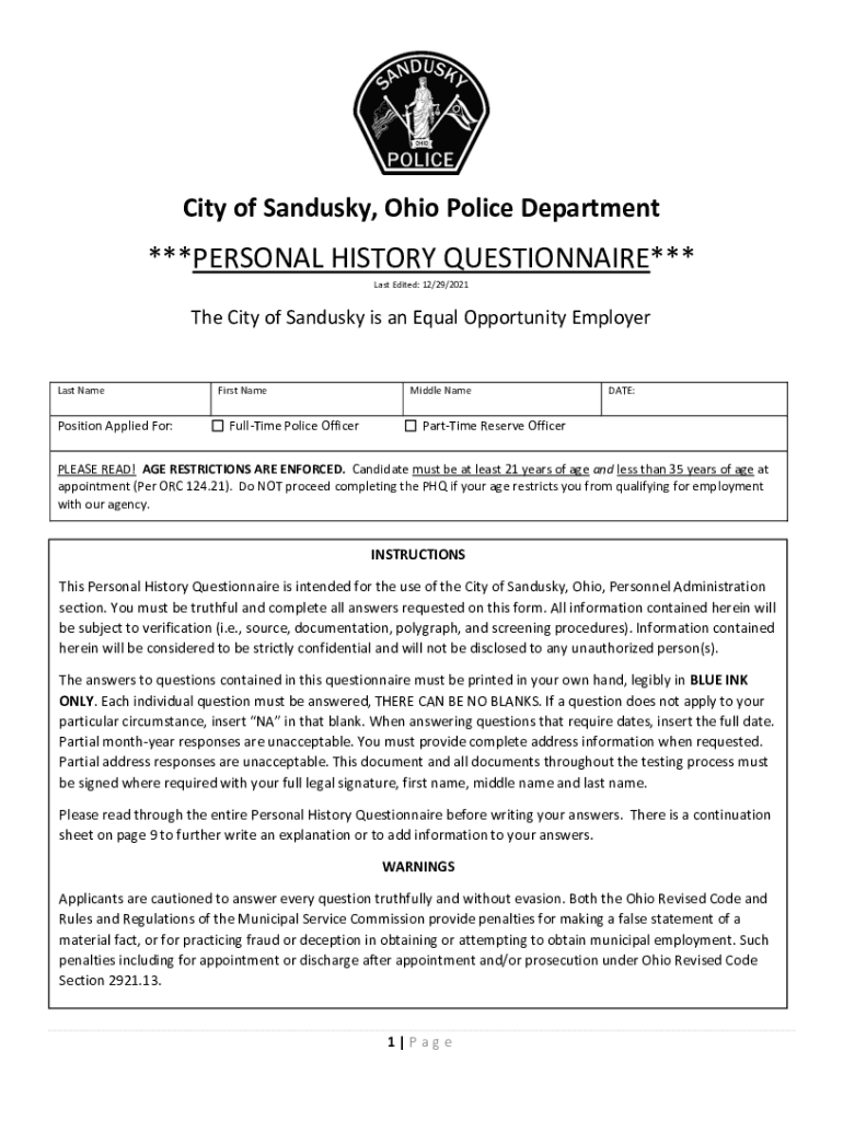 City of Sandusky, Ohio Police Department***PERSONAL HISTORY QUESTIONNAIRE*** Last Edited: 12/29/2021The City of Sandusky is an Equal Opportunity Employers Composition Applied For:First NameFullTime
