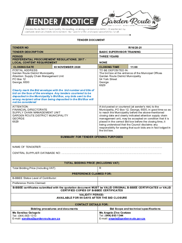 TENDER DOCUMENT TENDER NOR/16/2021TENDER DESCRIPTION BASIC SUPERVISOR TRAININGPERIOD PREFERENTIAL PROCUREMENT REGULATIONS, 2017 LOCAL CONTENT REQUIREMENTTHREE YEARS-LONG DATE 03 NOVEMBER 2020 POSTAL