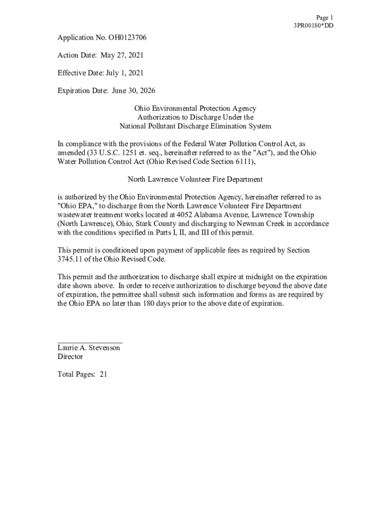 Page 1 3PR00180×Application No. OH0123706 Action Date: May 27, 2021, Effective Date: July 1, 2021, Expiration Date: June 30, 2026 Ohio Environmental Protection Agency Authorization to Discharge Under