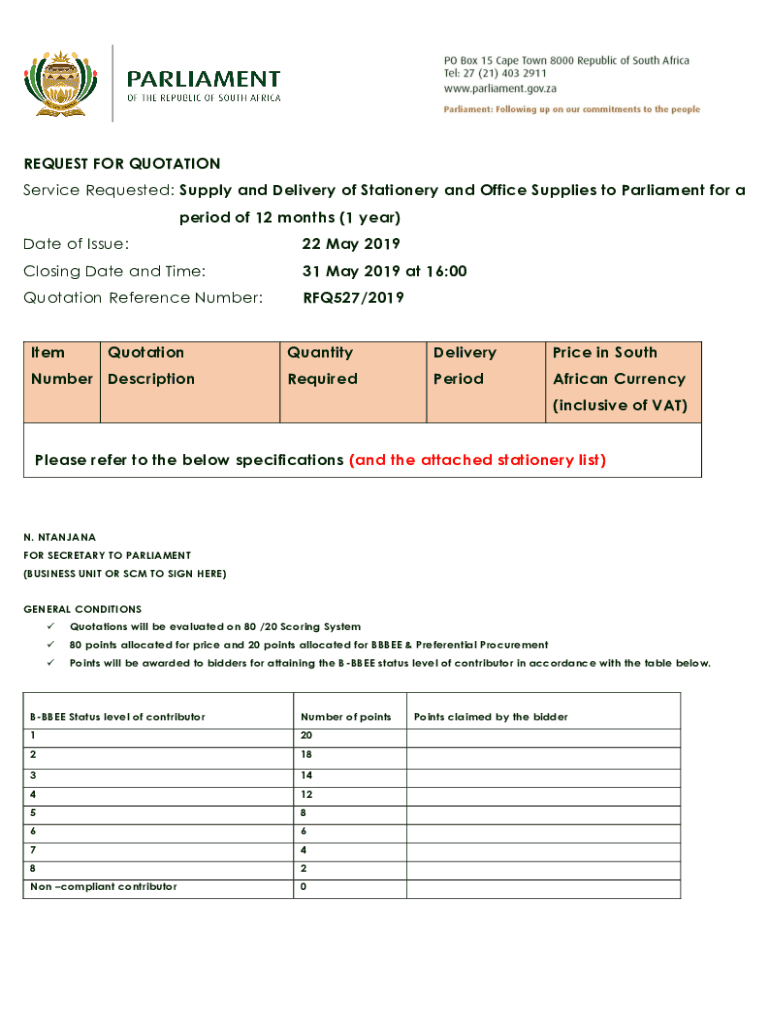 Get the free REQUEST FOR QUOTATION - Parliament of South Africa