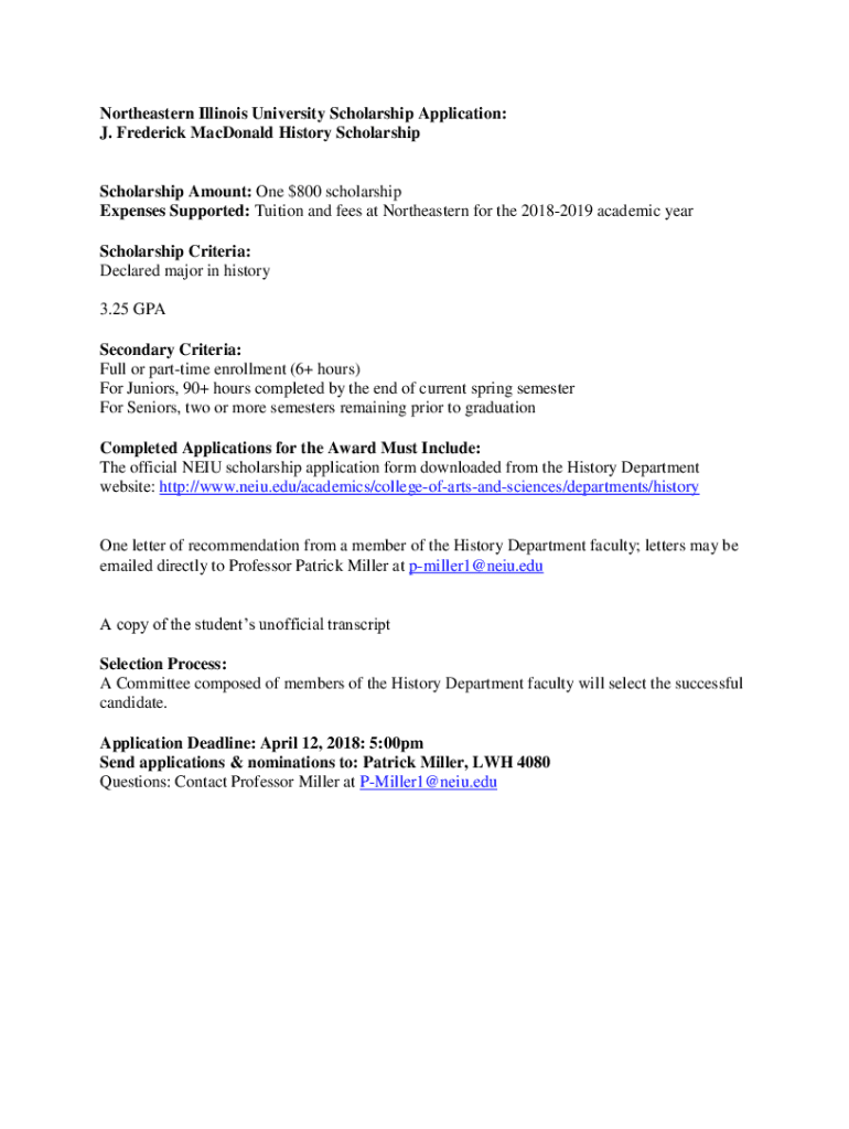 Northeastern Illinois University Scholarship Application: J. Frederick MacDonald History ScholarshipScholarship Amount: One $800 scholarship Expenses Supported: Tuition and fees at Northeastern for