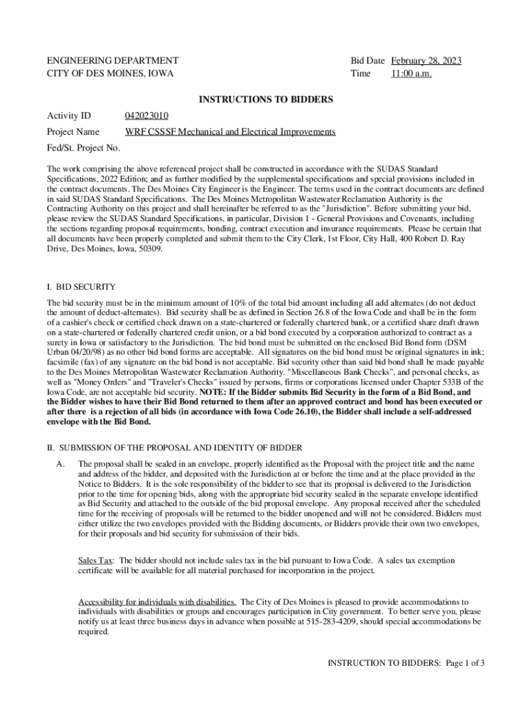 ENGINEERING DEPARTMENT CITY OF DES MOINES, Toward Date February 28, 2023, Time 11:00 a.m. INSTRUCTIONS TO BIDDERSActivity ID042023010Project Name CSSS Mechanical and Electrical Improvements Fed/St.