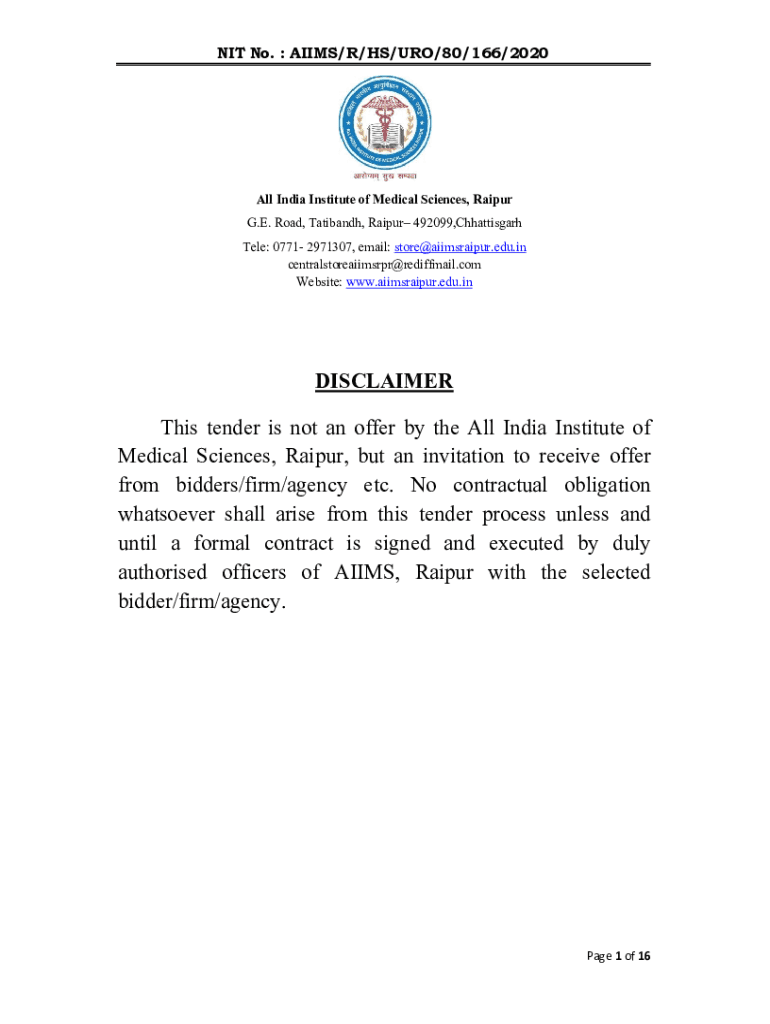 NIT No. AIMS/R/HS/PRO/80/166/2020All India Institute of Medical Sciences, Raipur G.E. Road, Taliban, Raipur 492099,Chhattisgarh Tell: 0771 2971307, email: store@aiimsraipur.edu.in centralstoreaiimsrpr@rediffmail.com