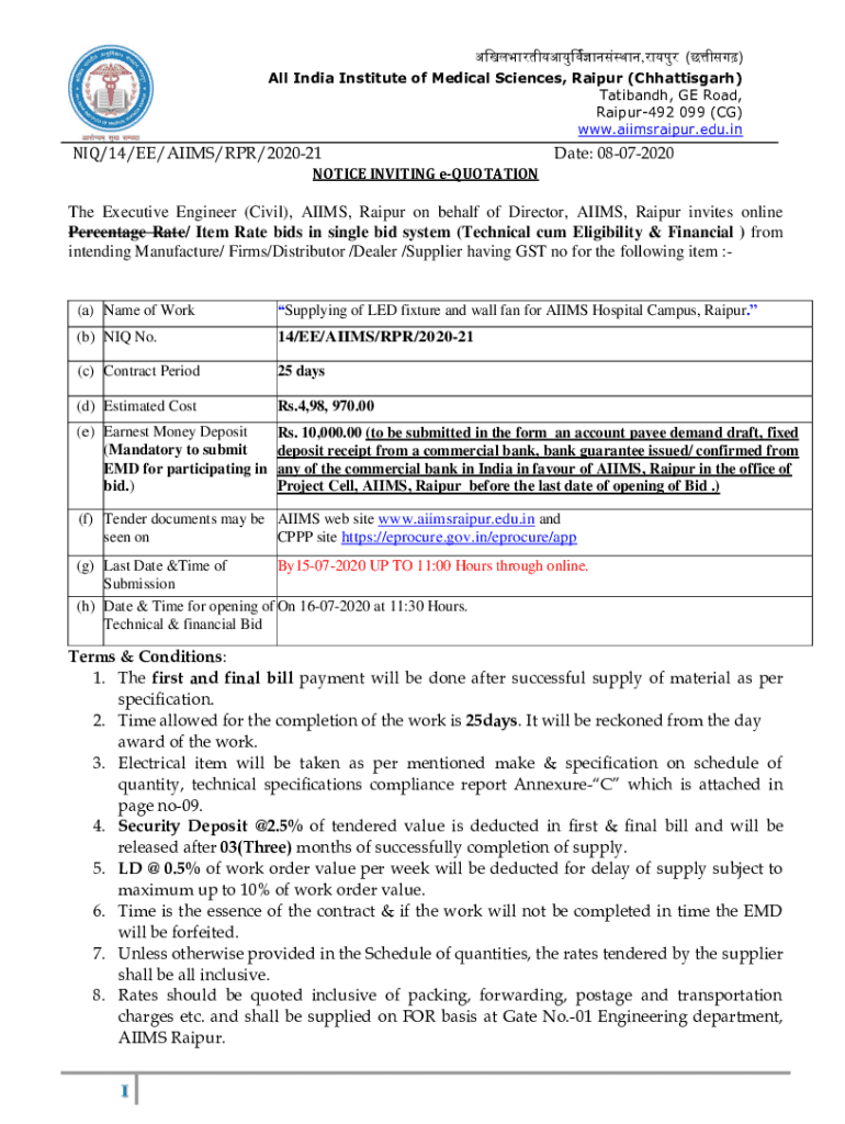 , () All India Institute of Medical Sciences, Raipur (Chhattisgarh) Taliban, GE Road, Raipur492 099 (CG) www.aiimsraipur.edu.inNIQ/14/EE/AIIMS/RPR/202021 NOTICE INVITING eQUOTATIONDate: 08072020The