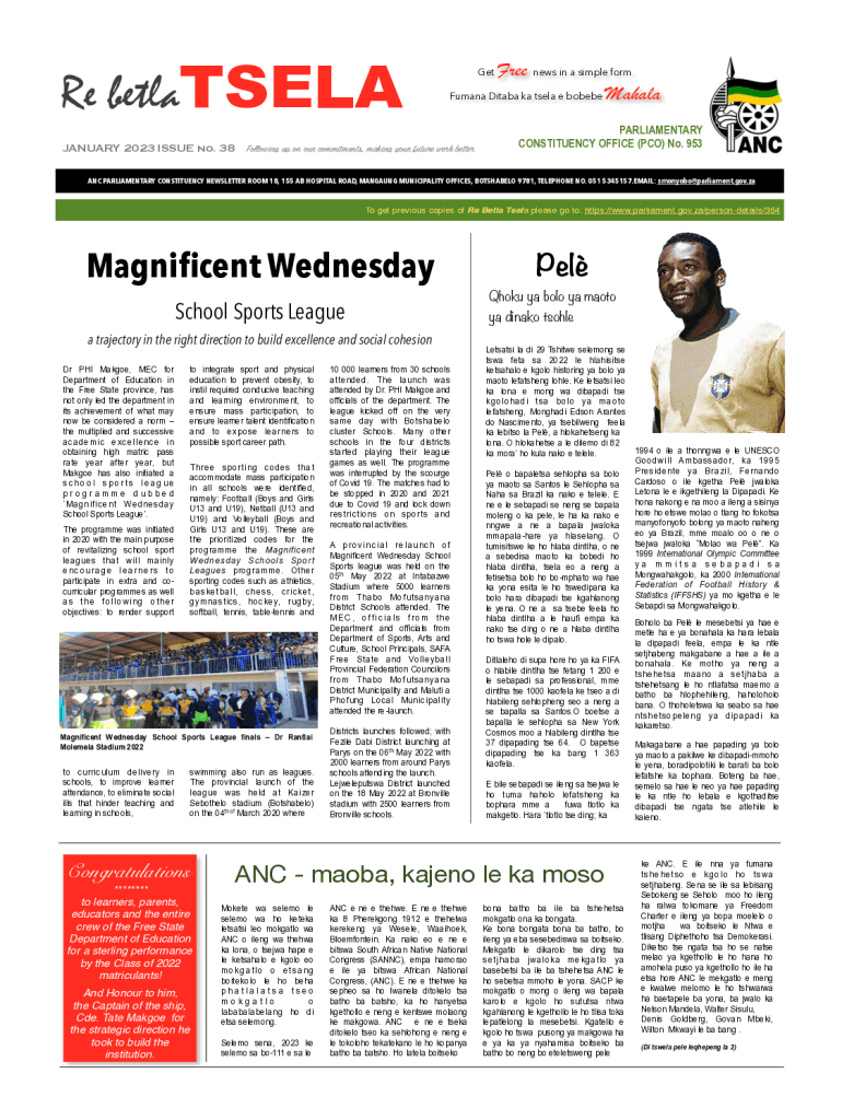 Re betlaTSELA JANUARY 2023 ISSUE no. 38F long unfree news in a simple form Human Diana key Tesla e Bobby Malala Get c fitments, making y r fut e w k parliamentary CONSTITUENCY OFFICE (PRO) No. 953ANC