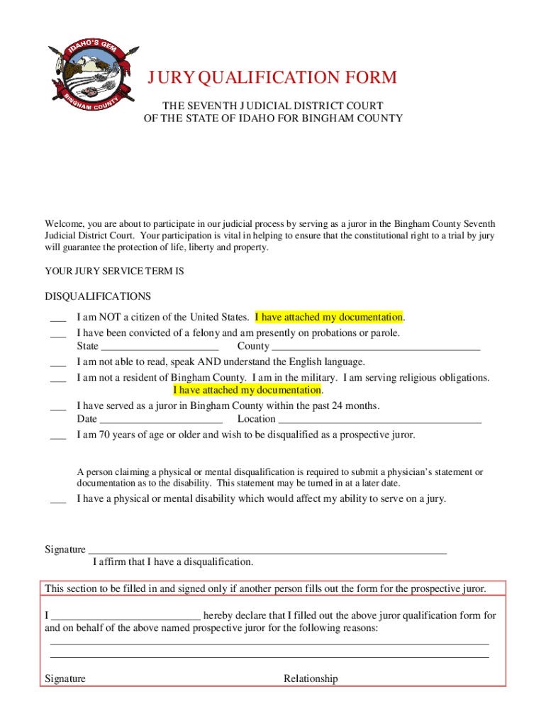 JURY QUALIFICATION FORM THE SEVENTH JUDICIAL DISTRICT COURT OF THE STATE OF IDAHO FOR BINGHAM COUNTYWelcome, you are about to participate in our judicial process by serving as a juror in the Bingham