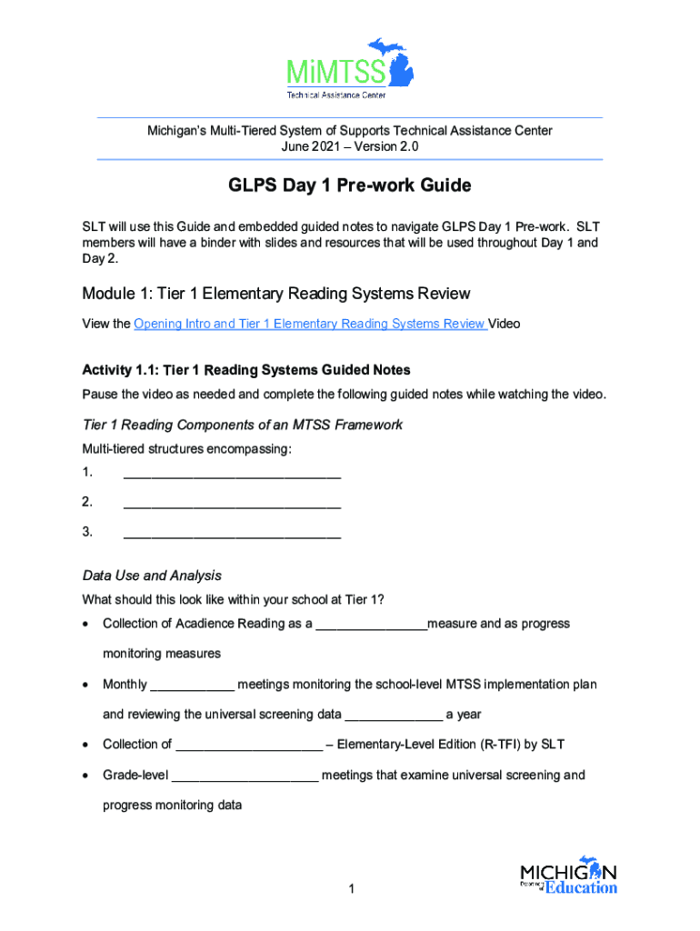 Michigan's MultiTiered System of Supports Technical Assistance Center June 2021 Version 2.0GLPS Day 1 Prework Guide SLT will use this Guide and embedded guided notes to navigate GPS Day 1 Prework.