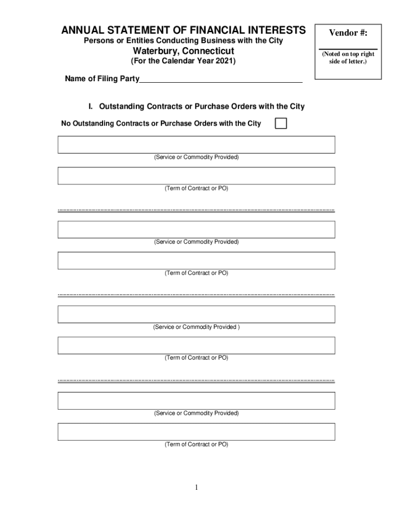 ANNUAL STATEMENT OF FINANCIAL INTERESTSVendor #:Persons or Entities Conducting Business with the City Waterbury, Connecticut (For the Calendar Year 2021)(Noted on top right side of letter.) Name of