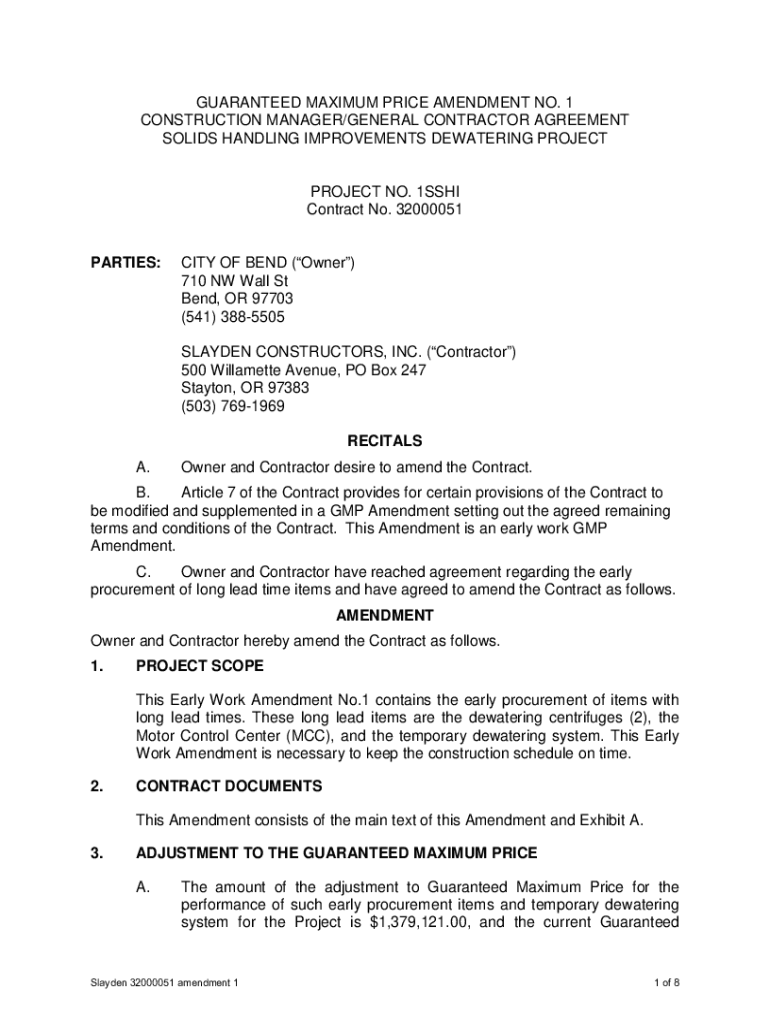 GUARANTEED MAXIMUM PRICE AMENDMENT NO. 1 CONSTRUCTION MANAGER/GENERAL CONTRACTOR AGREEMENT SOLIDS HANDLING IMPROVEMENTS WATERING PROJECTPROJECT NO. 1SSHI Contract No. 32000051PARTIES:CITY OF BEND
