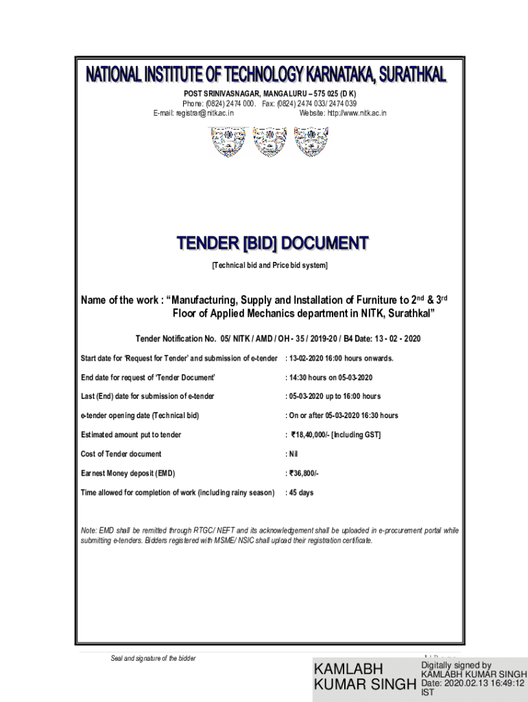 POST SRINIVASNAGAR, BENGALURU 575 025 (D K) Phone: (0824) 2474 000. Fax: (0824) 2474 033/ 2474 039 Email: registrar@nitk.ac.in Website: http://www.nitk.ac.in[Technical bid and Price bid system]Name
