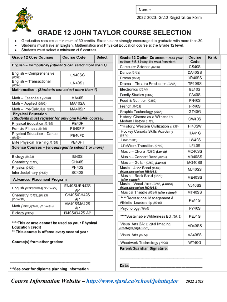 Name: 20222023: Gr.12 Registration Forbade 12 JOHN TAYLOR COURSE SELECTION Graduation requires a minimum of 30 credits. Students are strongly encouraged to graduate with more than 30. Students must