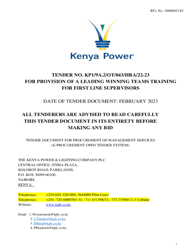 Rex No. 1000002144TENDER NO. KP1/9A.2/OT/043/HRA/2223 FOR PROVISION OF A LEADING WINNING TEAMS TRAINING FOR FIRST LINE SUPERVISORS DATE OF TENDER DOCUMENT: FEBRUARY 2023 ALL TENDERER ARE ADVISED TO