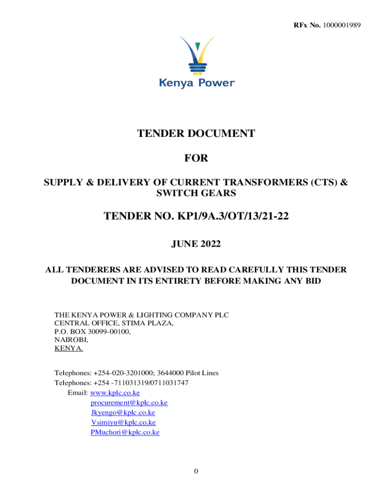 Rex No. 1000001989TENDER DOCUMENT FOR SUPPLY & DELIVERY OF CURRENT TRANSFORMERS (CTS) & SWITCH GOALTENDER NO. KP1/9A.3/OT/13/2122 JUNE 2022 ALL TENDERER ARE ADVISED TO READ CAREFULLY THIS TENDER DOCUMENT