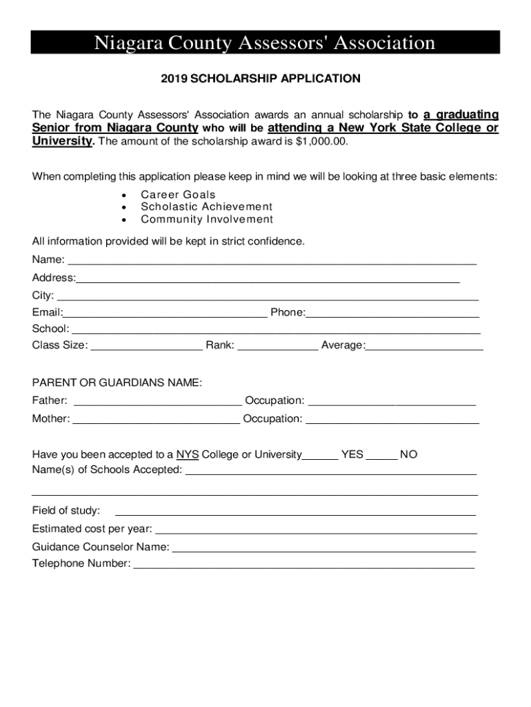 Niagara County Assessors\' Association 2019 SCHOLARSHIP APPLICATION The Niagara County Assessors\' Association awards an annual scholarship to a graduating Senior from Niagara County who will be attending