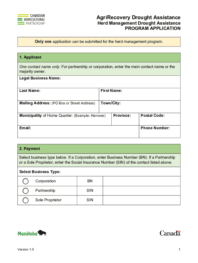 AgriRecovery Drought Assistance Herd Management Drought Assistance PROGRAM APPLICATIONOnly one application can be submitted for the herd management program.1. Applicant One contact name only. For