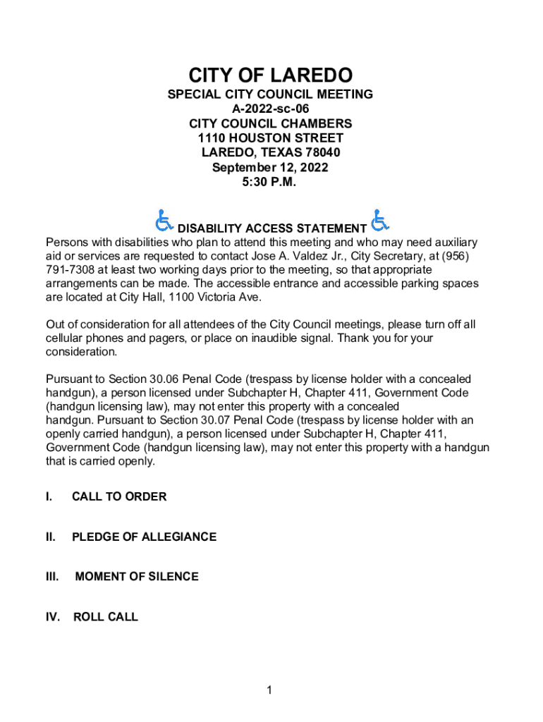 CITY OF LAREDO SPECIAL CITY COUNCIL MEETING A2022sc06 CITY COUNCIL CHAMBERS 1110 HOUSTON STREET LAREDO, TEXAS 78040 September 12, 2022 5:30 P.M. DISABILITY ACCESS STATEMENT Personswithdisabilitieswhoplantoattendthismeetingandwhomayneedauxiliary