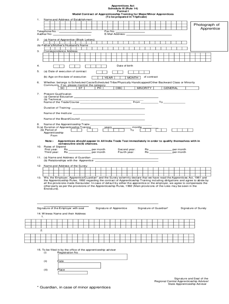 Apprentices Act Schedule III (Rule 14) Format I Model Contract of Apprenticeship Training for Major/Minor Apprentices (To be prepared in Triplicate) Name and Address of Establishment1. Photograph