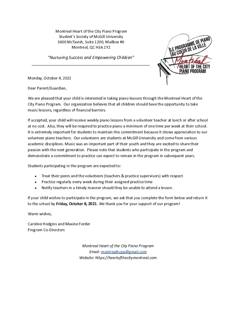 Montreal Heart of the City Piano Program Students Society of McGill University 3600 McDavis, Suite 1200, Mailbox #6 Montreal, QCH3A 1Y2Nurturing Success and Empowering Children Monday, October 4,