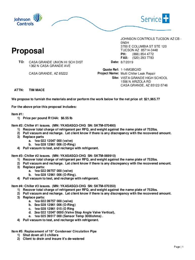 Proposal TO:CASA GRANDE UNION HI SCH DIST 1362 N CASA GRANDE AVE CASA GRANDE, AZ 85222ATTN:JOHNSON CONTROLS TUCSON AZ CB 0N0H 3700 E COLUMBIA ST STE 120 TUCSON AZ 857143448 PH: (866) 854 4772 Faxes: