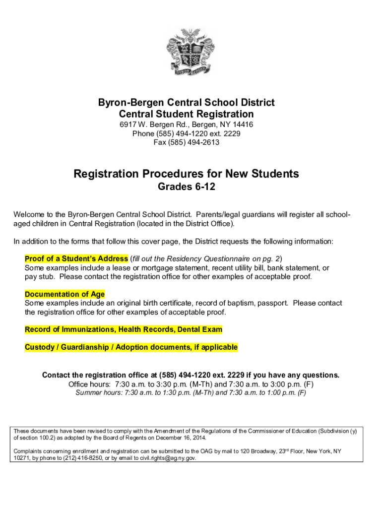 Byron Bergen Central School District Central Student Registration 6917 W. Bergen Rd., Bergen, NY 14416 Phone (585) 4941220 ext. 2229 Fax (585) 4942613Registration Procedures for New Students Grades