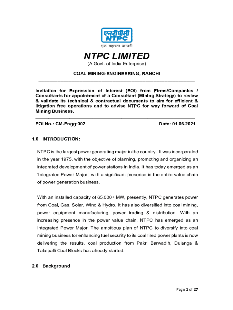 NPC LIMITED (A Govt. of India Enterprise) COAL MININGENGINEERING, RANCHI___ Invitation for Expression of Interest (EOI) from Firms/Companies / Consultants for appointment of a Consultant (Mining Strategy)