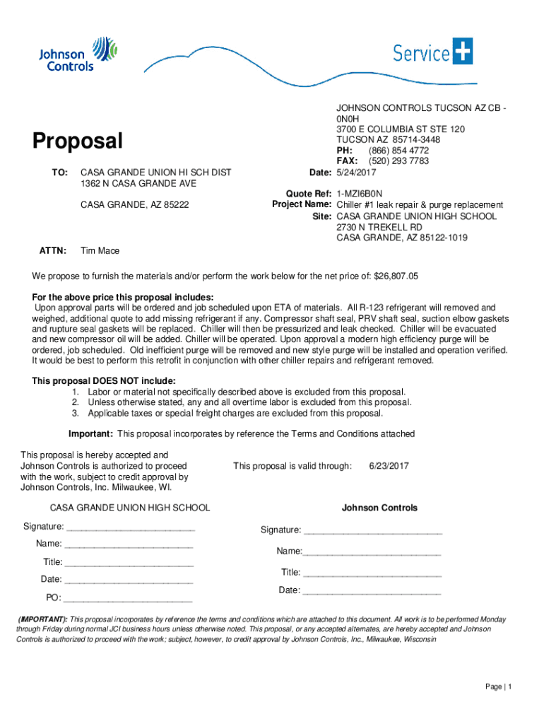 Proposal TO:CASA GRANDE UNION HI SCH DIST 1362 N CASA GRANDE AVE CASA GRANDE, AZ 85222ATTN:JOHNSON CONTROLS TUCSON AZ CB 0N0H 3700 E COLUMBIA ST STE 120 TUCSON AZ 857143448 PH: (866) 854 4772 Faxes: