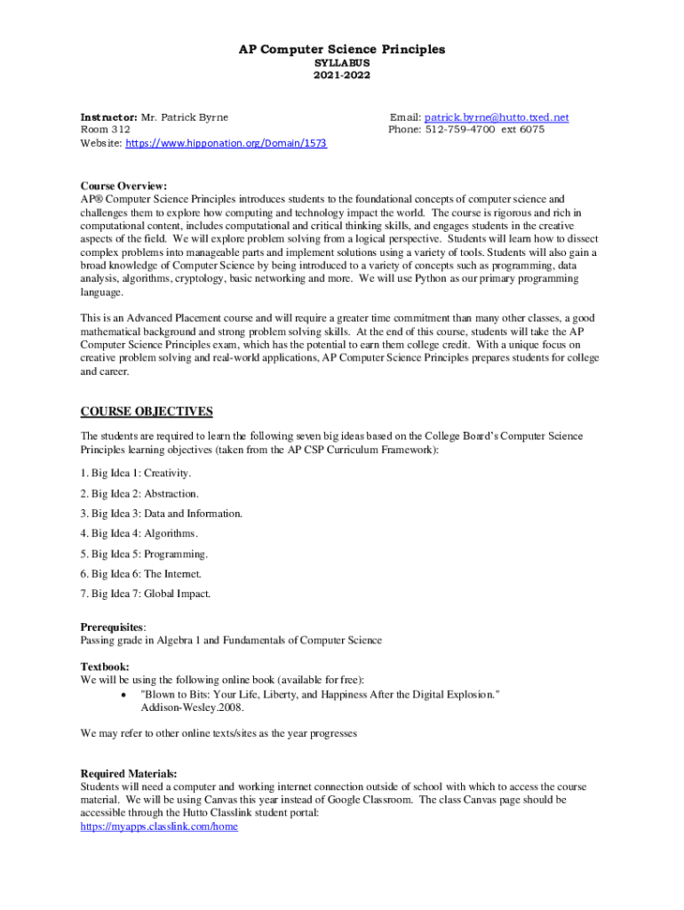 AP Computer Science Principles SYLLABUS 20212022Instructor: Mr. Patrick Byrne Room 312 Website: https://www.hipponation.org/Domain/1573Email: patrick.byrne@hutto.txed.net Phone: 5127594700 ext 6075Course