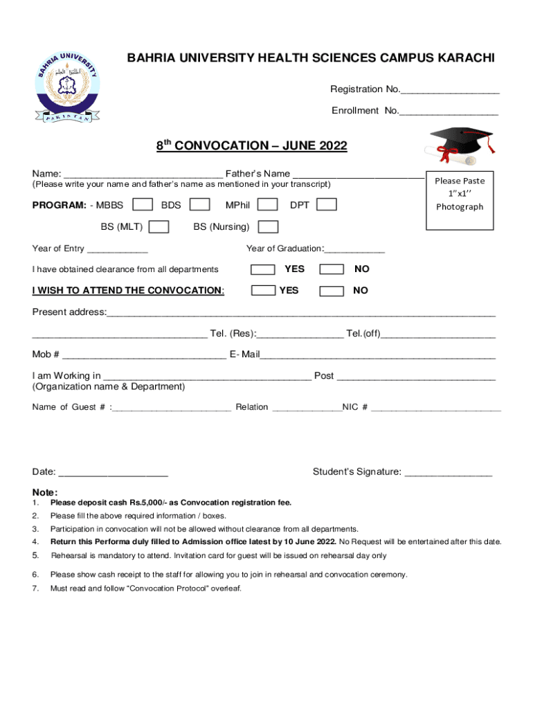 BAHIA UNIVERSITY HEALTH SCIENCES CAMPUS KARACHI Registration No.___ Enrollment No.___8th CONVOCATION JUNE 2022 Name: ___ Fathers Name ___ (Please write your name and fathers name as mentioned in your