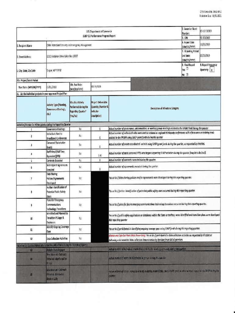 0 MB Control No. 06600042 Expiration Date: 01/31/20212. Award or Grant Number:$69101806914. EIN:[986019463U. S. Department of Commerce SLIP 2.0 Performance Progress Report !1. Recipient NamelcNMI