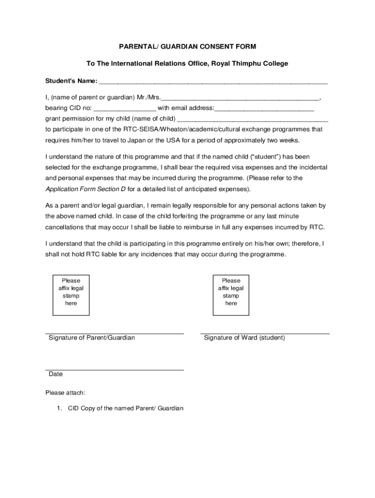PARENTAL/ GUARDIAN CONSENT FORM To The International Relations Office, Royal Thimphu College Students Name: ___ I, (name of parent or guardian) Mr./Mrs.___, bearing CID no: ___ with email address:___